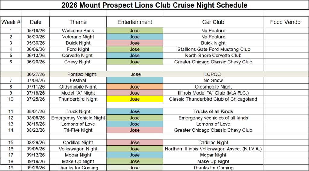 Cruise Nights typically run every Saturday from 3 pm to 8 pm (weather permitting) from May through September or October.
